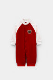 Score major style points this winter with our Baby Varsity Bear Romper. Made from soft, plush fleece, this unisex baseball-style jumpsuit captures the classic collegiate look while providing essential warmth. The bold red body and white raglan sleeves are accented by a cute embroidered bear mascot on the chest.