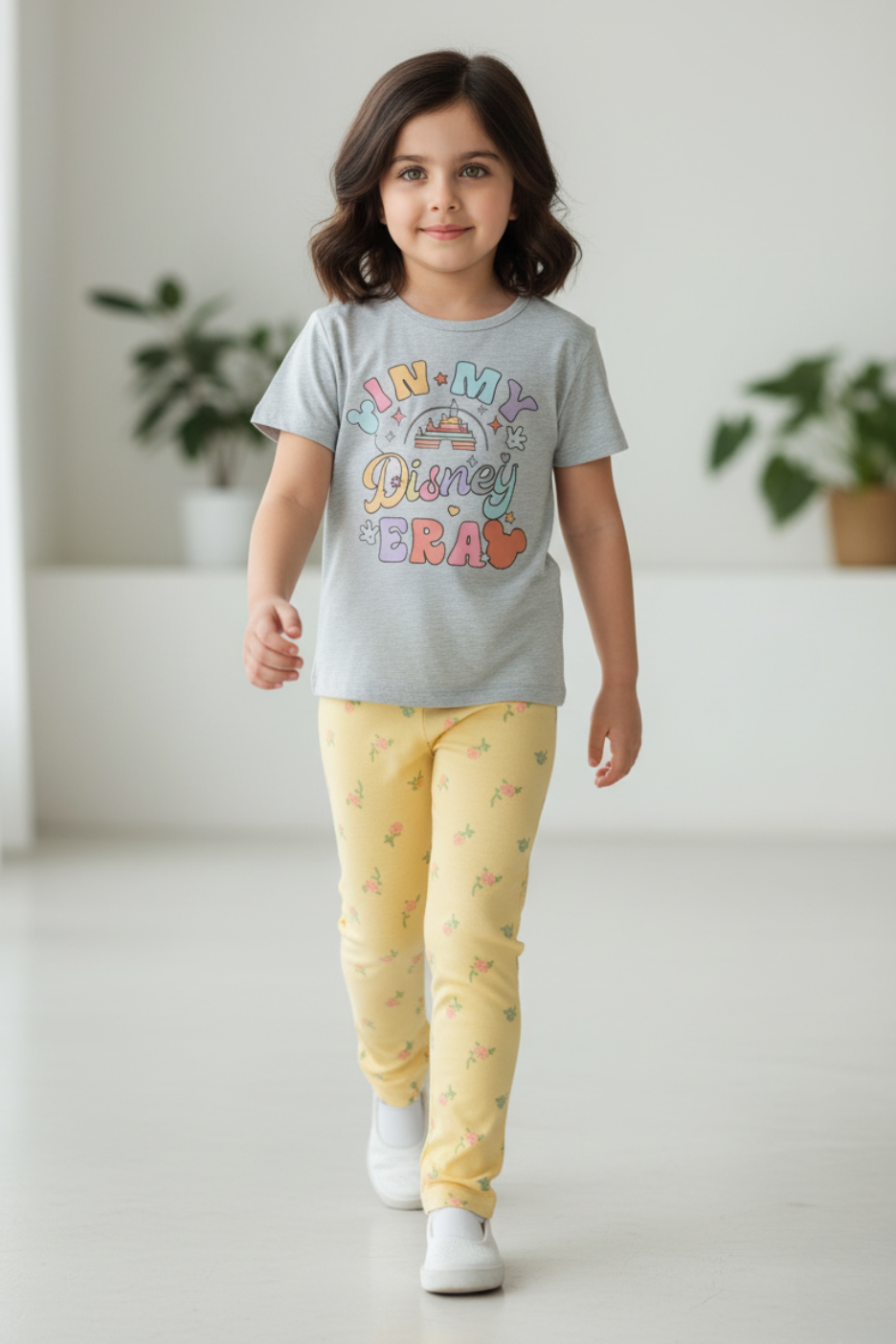 The Disney Era Tee & Floral Tights Set combines a soft cotton T-shirt with a vibrant Disney-themed print and matching floral lycra tights. Designed for comfort, style, and everyday play, this set is a cheerful addition to any kid’s wardrobe.