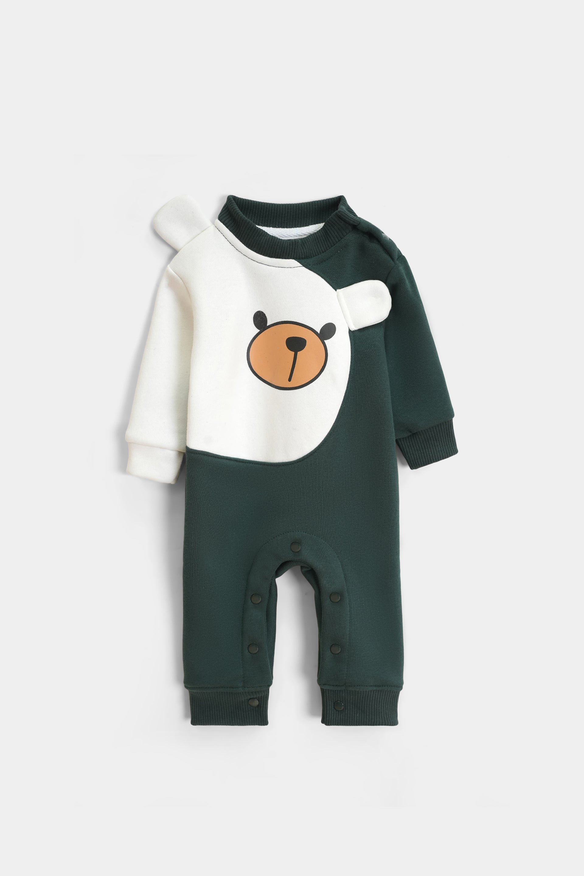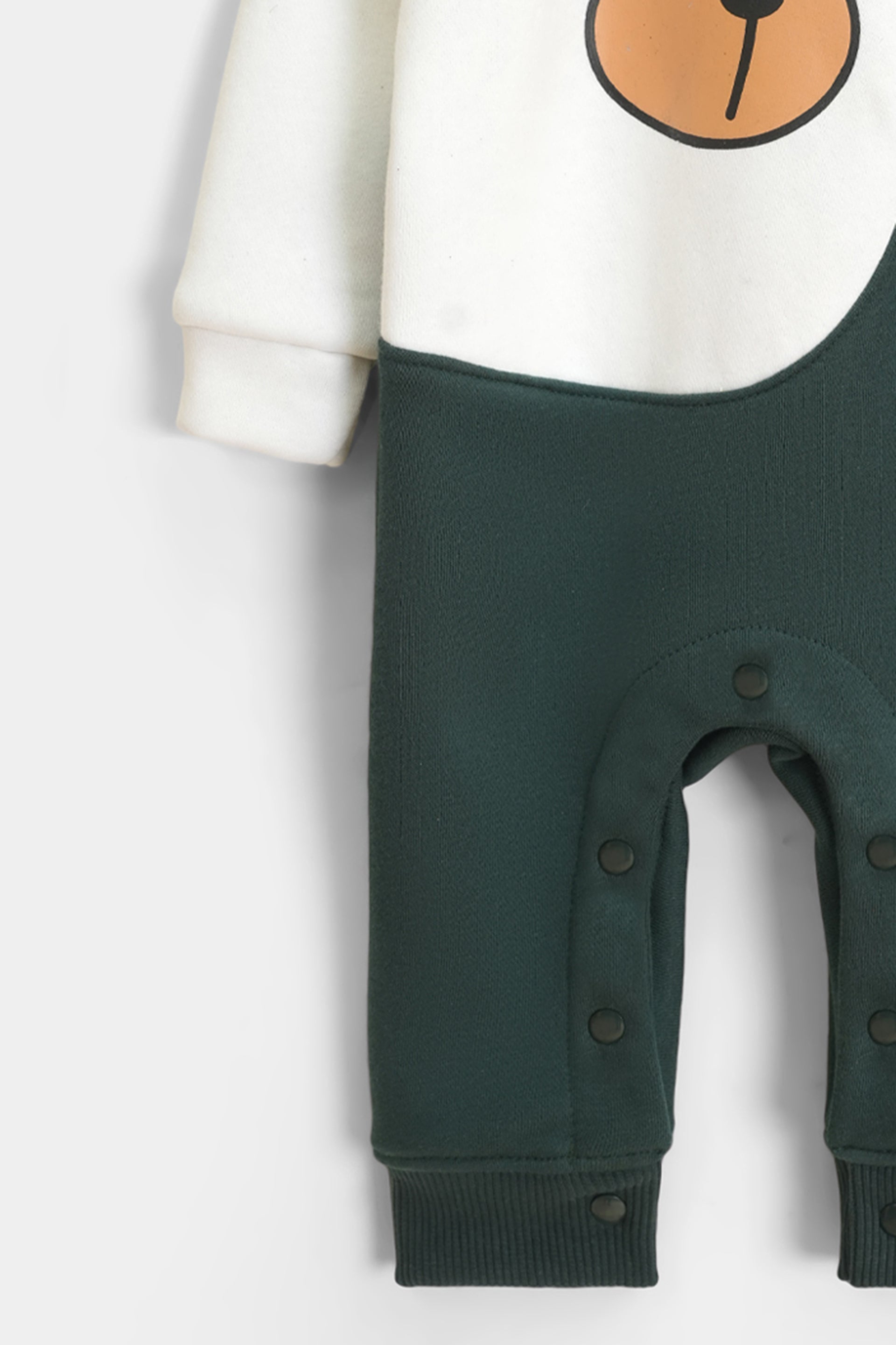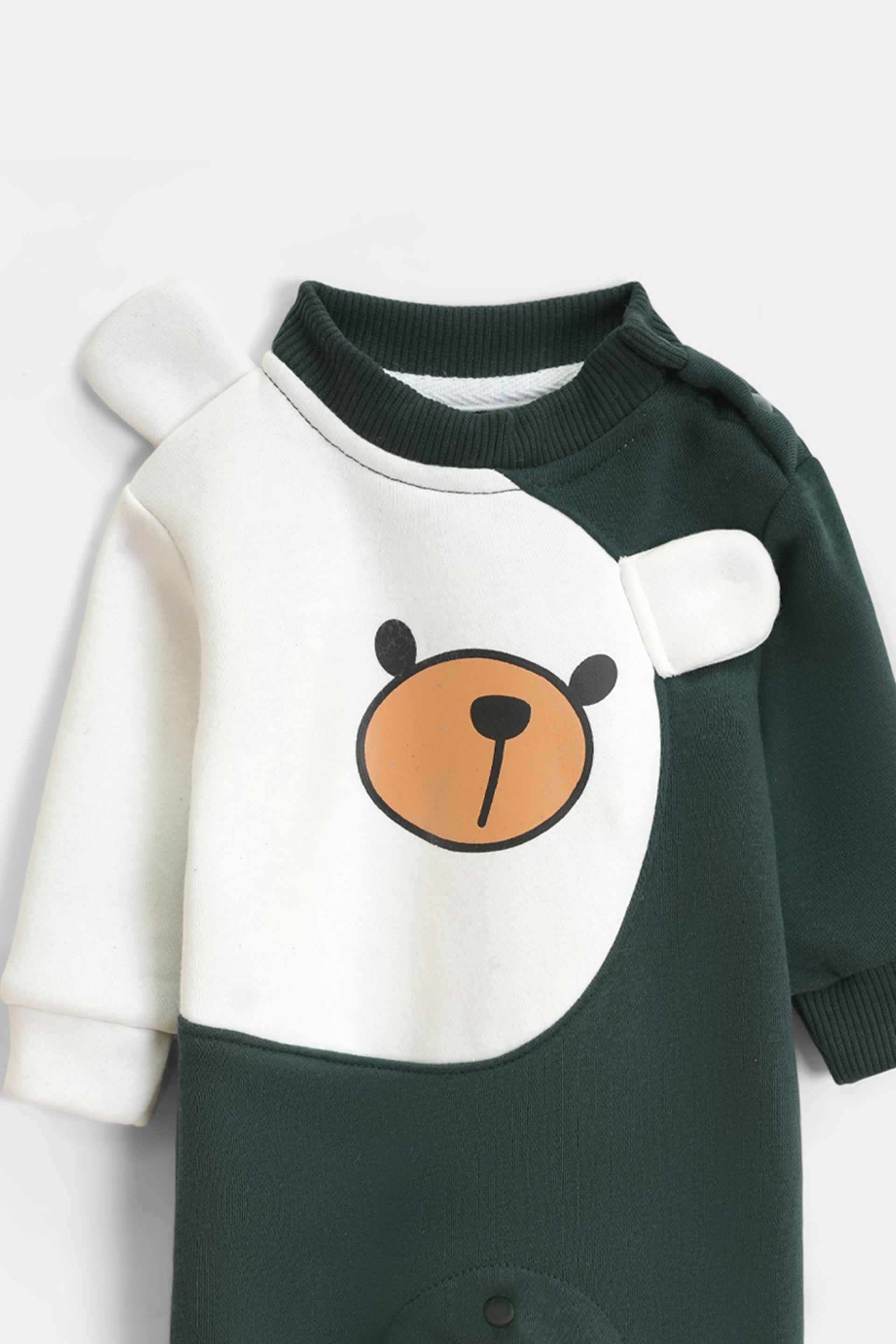 Add a touch of playful charm to your little one’s winter wardrobe with our Forest Green Bear Fleece Romper. This eye-catching unisex jumpsuit features a unique asymmetrical design in deep forest green and crisp white, made from thick, cozy fleece to handle the Pakistani winter chill.