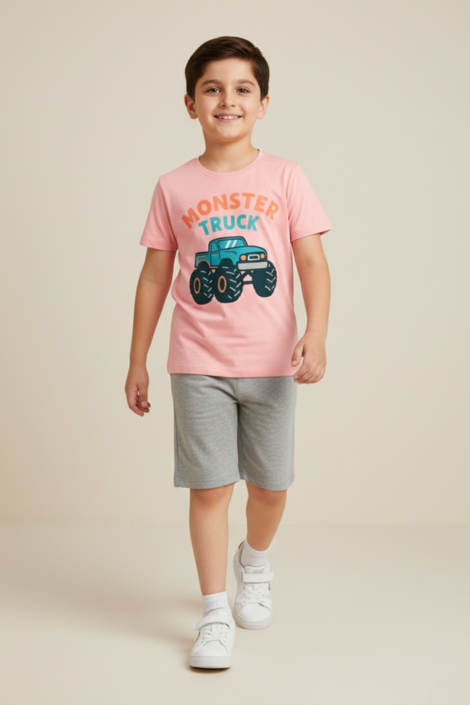 Get ready for a rumbling good time with this fun and comfy set. It includes a soft, 100% cotton t-shirt featuring a bold monster truck graphic and a pair of comfy grey terry shorts. This set is perfect for everyday adventures and active play.