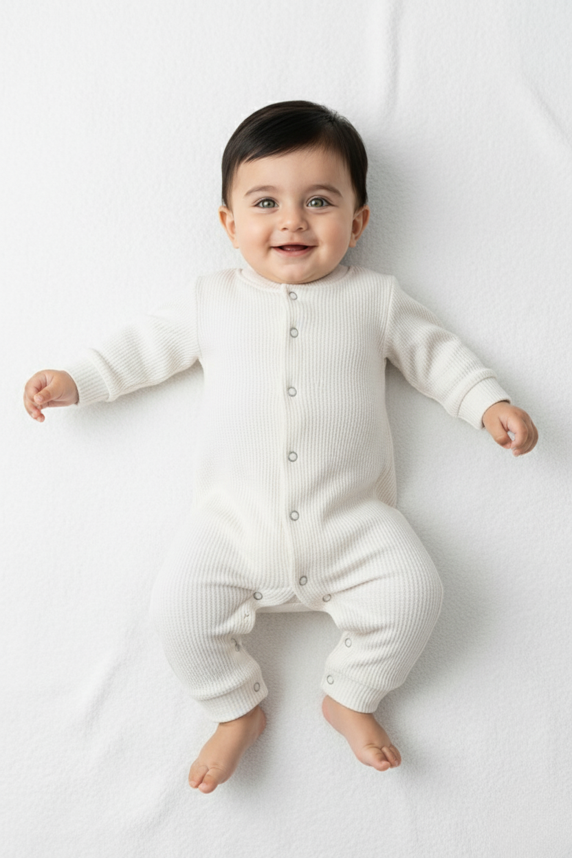 Wrap your baby in warmth and comfort with our Off-White Thermal Waffle Textured Baby Romper. Crafted from 100% organic cotton, it offers a soft, breathable fit for babies aged 0-18 months. Designed with plastic-free buttons for safety and sustainability, this romper is perfect for cozy winter days. A stylish and eco-friendly choice for your little one’s wardrobe.